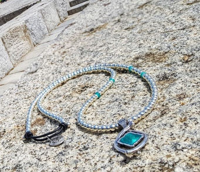 Long necklace bathed in silver with resins and green enameled piece, knot closure.