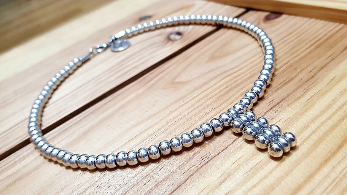 Short necklace with silver-plated beads, leather interior and strap closure.