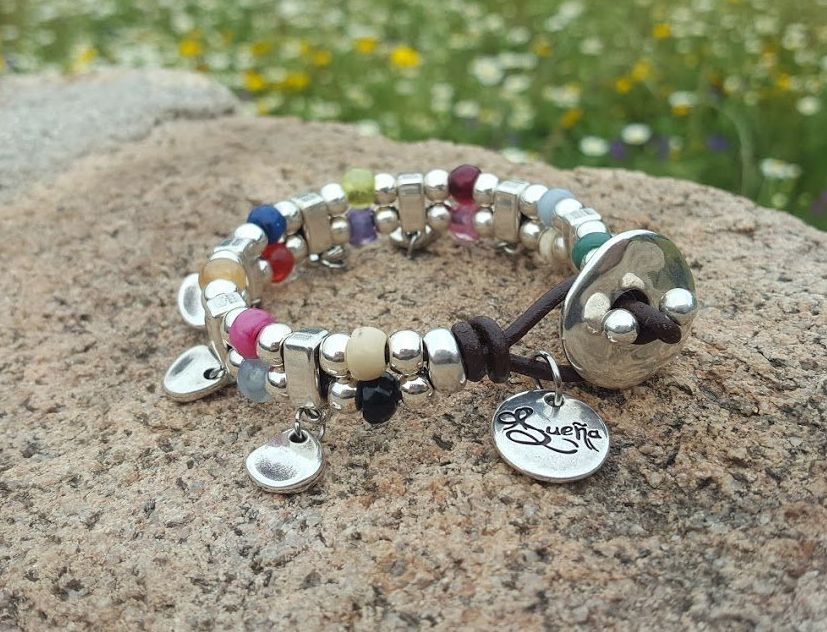 Bracelet bathed in silver, leather and natural stones, for more colors