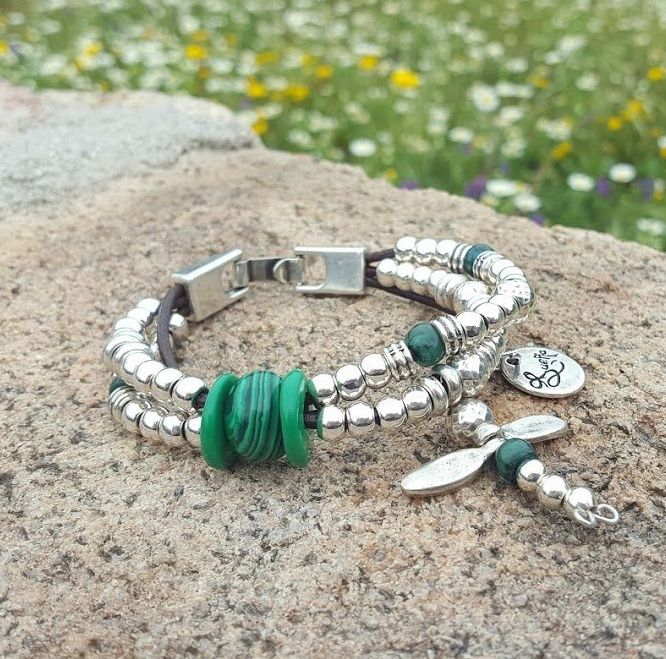 Beaded bracelet in silver and leather, colored resins, malachite clasp strap.