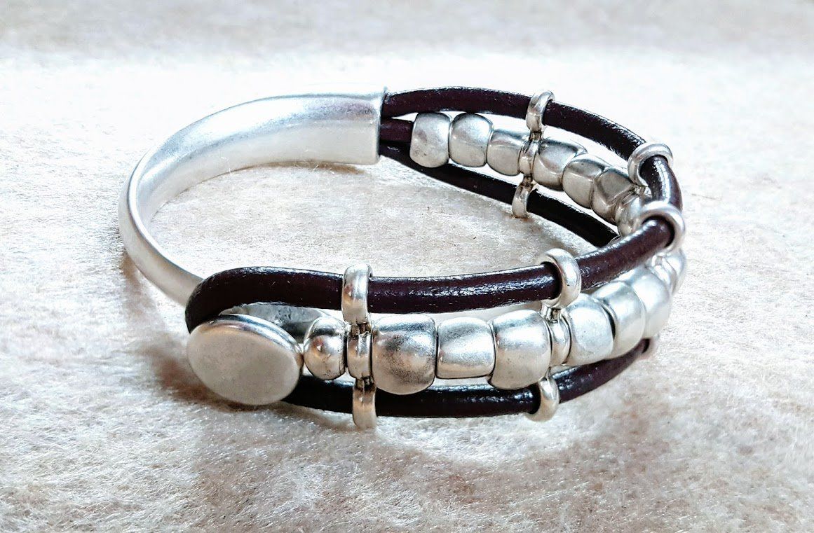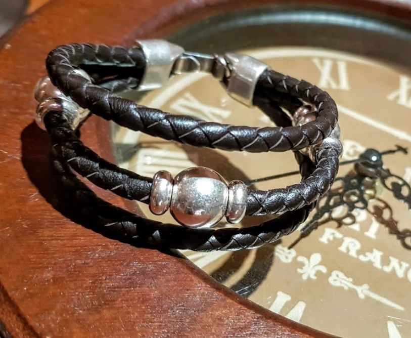Bracelet with silver-plated beads, braided leather and strap closure.
