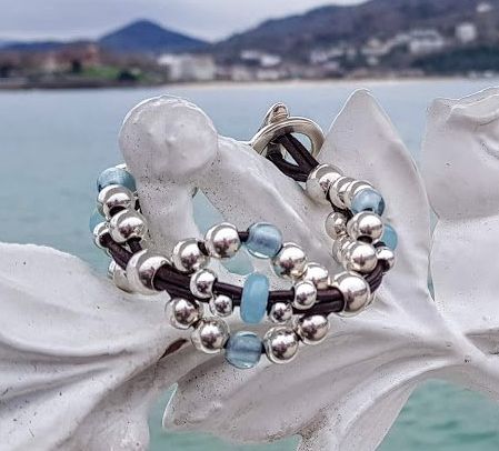 Bracelet with silver-plated beads, leather and resins, sky blue, T clasp
