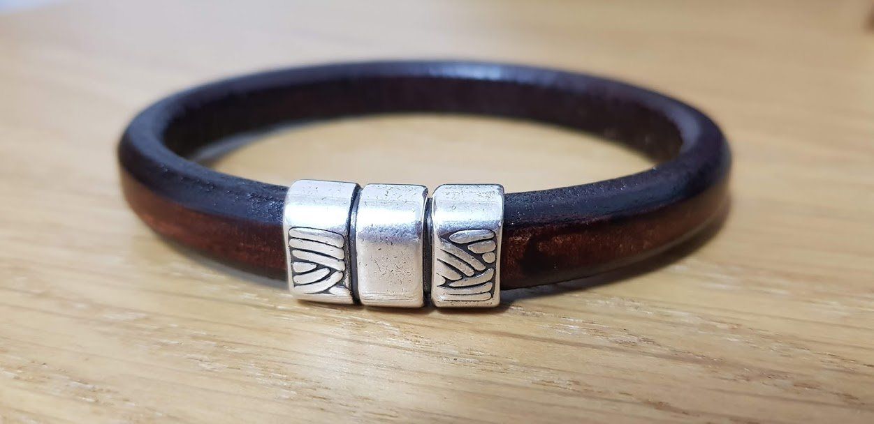 Bracelet de perles baigné d'argent, de cuir de réglisse et de fermeture à pression.