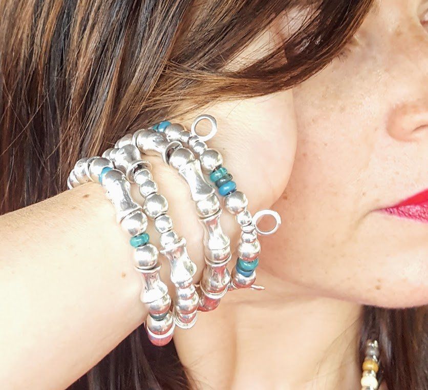 Bracelet quadruple en perles argentées, résines colorées, fermeture à bouton.