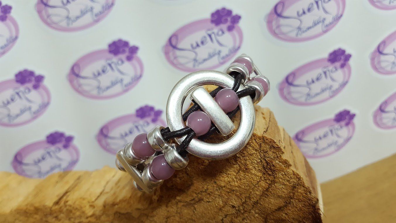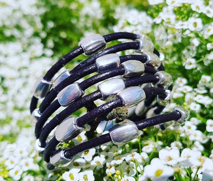 Bracelet avec perles argentées, double rangée semi-rigide, cuir.