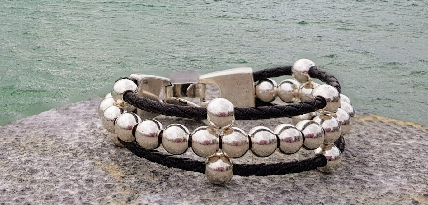 Bracelet avec perles en plaqué argent, cuir tressé et fermeture à lanière.