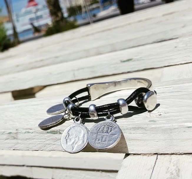 Bracelet quadruple avec des pièces de monnaie, baigné d'argent et de cuir avec fermeture à bouton.