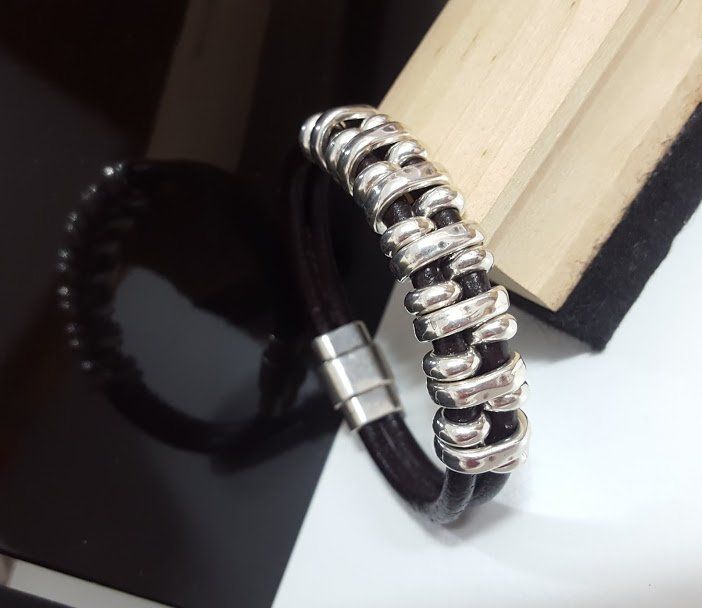 Pulsera abalorio bañados en plata, cuero regaliz y cierre presión.