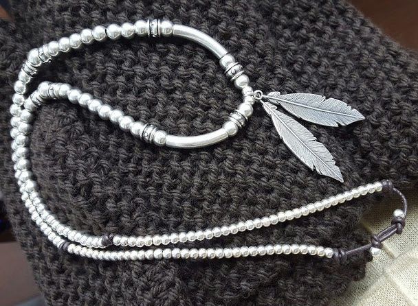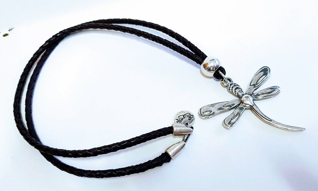 Длинное колье-стрекоза, обтянутое серебром, плетеная кожа (шоколад или верблюд) и ремешок.