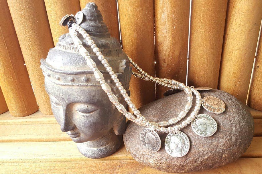 Двойное короткое ожерелье, купленное в серебре, монеты, кожа и ремешок.