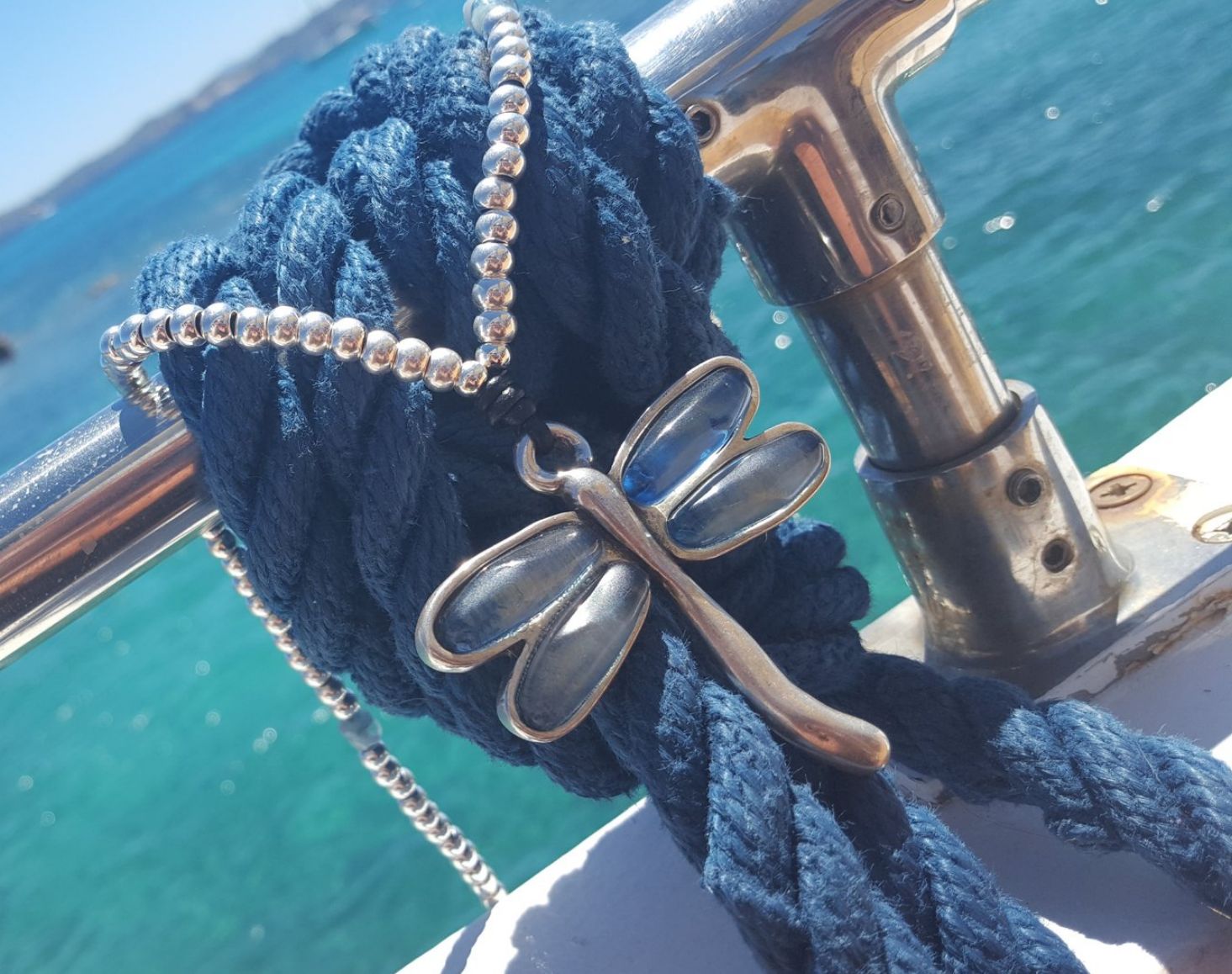 Длинное серебряное ожерелье со стрекозой