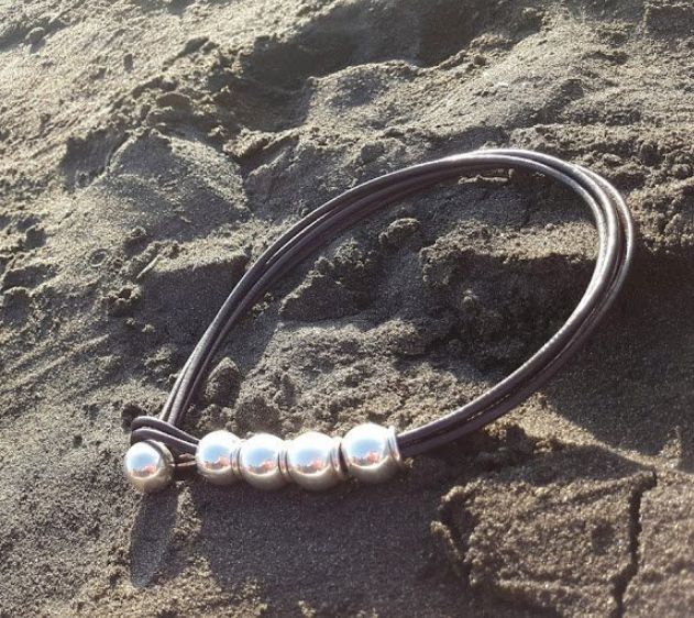 Короткое колье с посеребренными бусинами, кожаный салон и ремешок.